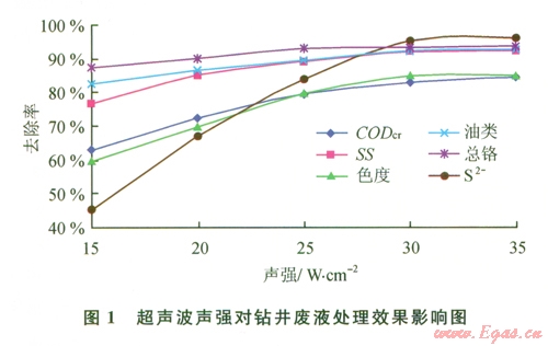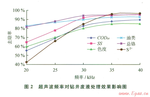 從表2可以看出,經(jīng)過聲化學(xué)復(fù)合技術(shù)對鉆井廢液進(jìn)行處理后,其處理效果非常明顯,處理后所有的污染指標(biāo)濃度均下降大,其中總鉻、油類、色度、S-2達(dá)到一級排放標(biāo)準(zhǔn);SS達(dá)到二級排放標(biāo)準(zhǔn)。CODcr18 430 mgL降到l 382 mgL,去除率達(dá)到92.5%。