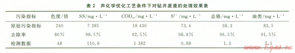 通過上述實驗分析,對于鉆井廢液采用聲化學(xué)脫穩(wěn)混凝優(yōu)化工藝為:聲強(qiáng)30 Wcm2、頻率35 kHz、時間20 min、PAC加量0.6%。在此條件下處理鉆井廢液結(jié)果如表2所示。