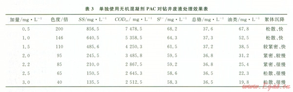 取一定鉆井廢液,調(diào)節(jié)pH值為89,直接用混凝劑PAC進(jìn)行混凝處理,考察處理后鉆井廢液主要污染指標(biāo),結(jié)果如表3所示。