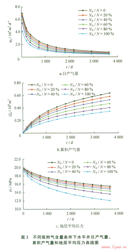 圖2給出了不同吸附氣含量條件下頁(yè)巖氣水平井的日產(chǎn)氣量、累積產(chǎn)氣量和地層平均壓力曲線。由圖2可知:吸附氣含量直接影響氣井的初始產(chǎn)量和遞減速度。吸附氣含量由0至100%時(shí),對(duì)應(yīng)的初始產(chǎn)氣量分別為6.97×