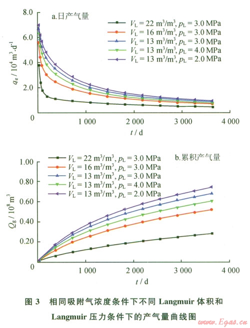 圖3給出了相同吸附氣濃度和開發(fā)條件下,不同Langmuir體積(VL)和Langmuir壓力(pL)對(duì)應(yīng)的日產(chǎn)氣量和累積產(chǎn)氣量。吸附氣濃度相同時(shí),隨Langmuir體積和Langmuir壓力增加,頁(yè)巖氣水平井初始產(chǎn)氣量和相同開發(fā)時(shí)間累積產(chǎn)氣量逐漸降低,產(chǎn)量遞減速度加快。吸附氣濃度相同時(shí),Langmuir壓力和Langmuir體積直接影響吸附氣開始解吸附的條件。