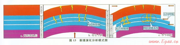 通過(guò)裂縫演化分析認(rèn)識(shí)到(圖13):受膏鹽巖“上拱”影響,西區(qū)構(gòu)造變形處砂巖常發(fā)育高角度構(gòu)造縱張縫。受龍門山南動(dòng)向應(yīng)力擠壓,是砂巖間的薄層泥巖發(fā)生層間錯(cuò)動(dòng),從而形成近水平層間滑脫縫。構(gòu)造縫+層間縫=網(wǎng)狀裂縫是儲(chǔ)層重點(diǎn)目標(biāo)。