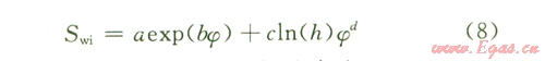 根據(jù)研究區(qū)低阻形成的機(jī)理可知,本區(qū)低阻氣層以細(xì)砂巖、粉細(xì)砂巖為主,顆粒細(xì)、排驅(qū)壓力大、束縛水飽和度較高;低阻氣層中的陽(yáng)離子交換量很低,因而泥質(zhì)的附加導(dǎo)電性可以忽略。因此,對(duì)于這類(lèi)高束縛水飽和度引起的低阻油氣藏可用以下模型計(jì)算含水飽和度:
