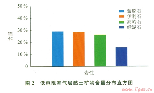 根據(jù)薄片鑒定分析和粒度分析資料,東方區(qū)塊低電阻率氣層巖性主要為由細(xì)-極細(xì)粒的石英粉砂和泥質(zhì)組成的泥質(zhì)粉砂巖。圖1為低阻氣層巖心粒度分析的黏土與粉砂含量分布直方圖,可見(jiàn)低阻氣層巖石顆粒成分主要為黏土與粉砂,二者之和約為80%。圖2為低阻氣層巖心X射線衍射分析得到的黏土礦物分布直方圖,由圖可見(jiàn),低阻氣層的黏土礦物主要為蒙脫石與伊利石,兩者的含量總和達(dá)到60%。細(xì)顆粒巖性對(duì)儲(chǔ)層電阻率的影響主要體現(xiàn)在以下兩方面:①儲(chǔ)層中細(xì)顆粒成分越多,巖石的比表面積就會(huì)越大,顆粒表附大量的束縛水,增強(qiáng)巖石導(dǎo)電性;②小巖粒含量越高,地層中小孔隙和小喉道就越發(fā)育,使巖層中殘余水(束縛水)含量急劇升高,這又增強(qiáng)了巖石導(dǎo)電性,使地層電阻率下降。由此可見(jiàn),巖性細(xì)是形成東方區(qū)塊部分氣層低電阻率特性的基本地質(zhì)環(huán)境[3-5]。