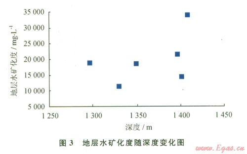 圖3為東方氣田地層水礦化度特征圖。由圖3可見(jiàn),東方氣田地層水礦化度較高,在15 000~25 000mg/L,最高為35 000 mg/L。在地層溫度下,高礦化度地層水是一種很好的導(dǎo)電體。