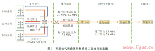 BB9'或BB9〞井叢9口氣井原料氣經(jīng)井下節(jié)流后,通過孔板流量計(jì)連續(xù)計(jì)量,與該井叢另外8口氣井的天然氣匯集后,與附近3座或2座BB9井叢輸來的原料氣匯合后輸至本區(qū)塊集氣站。