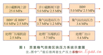 2)蘇里格氣田推廣使用的中低壓集氣方法主要特征是:井下節(jié)流、井口不注醇、集氣站設(shè)壓縮機(jī);夏季中壓運(yùn)行,井口壓力為4.0 MPa,到集氣站壓力為3.6MPa,直接外輸;冬季低壓運(yùn)行,井口壓力為l.3 MPa,集氣站增壓至3.6 MPa后外輸,集氣站總增壓能力與氣田產(chǎn)能相一致。蘇里格氣田南區(qū)塊中壓集氣主要特征是:井下節(jié)流、井叢集中注醇、集氣站后期設(shè)壓縮機(jī);前期運(yùn)行井口壓力為5.0 MPa,到集氣站壓力為3.6MPa,直接外輸;后期運(yùn)行井口壓力為2.5 MPa,集氣站增壓至3.6 MPa后外輸,集氣站總增壓能力約為氣田產(chǎn)能的一半。