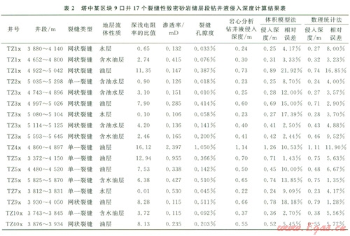 基于上述理論和方法,結(jié)合巖心分析、測井、鉆井、地層流體測試資料,對研究工區(qū)9口井選擇水基(鹽水)鉆井液的l7個層位裂縫性致密砂巖儲層段鉆井液侵入深度進行了定量計算,結(jié)果見表2。