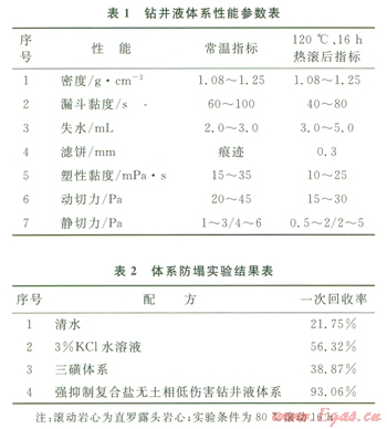 考慮體系總固相含量控制的要求和強(qiáng)抑制性的需要,重點(diǎn)研究了可溶性有機(jī)鹽、無(wú)機(jī)鹽在提高液相密度和鉆井液抑制性的作用,體系防塌實(shí)驗(yàn)結(jié)果見(jiàn)表2。有機(jī)鹽溶液自身具有較高的密度,僅其水溶液密度就可超過(guò)1.25 9/cm3,復(fù)配使用無(wú)機(jī)鹽就可以提高體系的抑制性,以滿足防塌的要求。另外輔以G302-SZD等即可形成具有較好封堵作用的濾餅,進(jìn)一步提高體系的防塌效果。