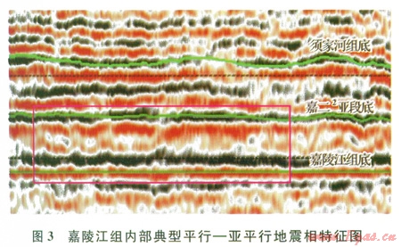 本區(qū)嘉陵江組沉積期內(nèi)代表水動(dòng)力環(huán)境較低能的沉積相類型主要為灘間海、半局限潟湖、開闊潮下等亞相。此類相多發(fā)育于水深相對(duì)較大或臺(tái)地內(nèi)較低洼地區(qū),沉積物以粒細(xì)、色暗為特征,巖性以灰色、褐灰色泥晶灰?guī)r、泥灰?guī)r及灰綠色泥(頁(yè))巖等以反映較低能沉積環(huán)境的巖石類型為主。根據(jù)單井相標(biāo)定成果,灘間海與開闊潮下亞相與平行—亞平行地震相相對(duì)應(yīng),半局限潟湖則與雜亂相對(duì)應(yīng)。