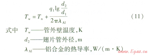 利用通過圓筒壁的導(dǎo)熱公式,計(jì)算沒有翅片部分管外壁的溫度Tw,此溫度即為翅片的根部溫度。