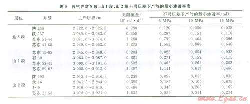 根據(jù)單層試氣井試氣資料,在產(chǎn)能一定的情況下,就可以計算出蘇東地區(qū)主力氣層段產(chǎn)工業(yè)氣的滲透率下限(3)。根據(jù)目前蘇東地區(qū)天然氣儲量規(guī)范,2 0003 000 m井深的天然氣井達到工業(yè)氣流的標準為0.3×104 m3a。當采用生產(chǎn)壓差為5 MPa開采時,盒8段產(chǎn)層產(chǎn)氣的滲透率下限為0.120 mD,山l段產(chǎn)層產(chǎn)氣的滲透率下限為0.085 mD,山2段產(chǎn)層產(chǎn)氣的滲透率下限為0.097 mD,這和前述方法得到的結果基本符合。