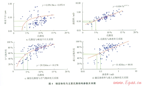 通過蘇東地區(qū)壓汞資料分析認為,壓汞汞驅(qū)替巖樣中潤濕相的過程與地下氣相驅(qū)替地層水的過程是相似的[7]。當試驗壓力轉(zhuǎn)化為喉道半徑后,可得到每塊巖樣的含汞()飽和度與喉道半徑之間的相關關系(1);再根據(jù)該樣品實測的孔隙度、滲透率值,可得到孔隙度、滲透率、喉道半徑、含汞()飽和度4者的關系圖(4)。