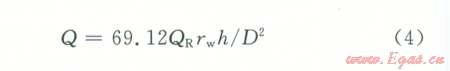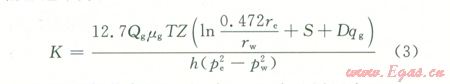 式中Qg為氣井產(chǎn)量,104 m3d;pe為地層壓力,MPa;pw為氣井生產(chǎn)時井底流壓,MPa;T為氣層溫度,K;µg為氣體的地下黏度,mPa·s;Z為氣體的偏差系數(shù);h為有效厚度,m;re為泄流半徑,m;rw為井眼半徑,m;K為氣層滲透率,mD。這里討論的是氣體流動的最小滲透率值,故可以將井看作為完善井,即設SDqg等于0