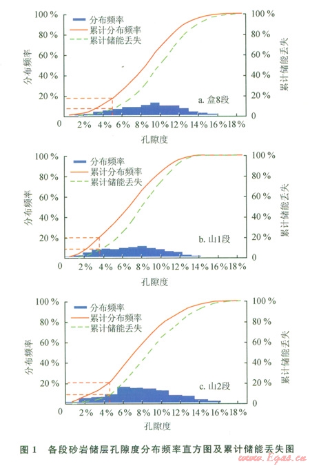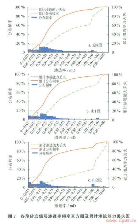 經(jīng)驗統(tǒng)計法是以巖心分析孔隙度、滲透率資料為基礎,以低孔滲段累計儲滲能力丟失占總累計的5%左右為界限的一種累計頻率統(tǒng)計法,現(xiàn)已被國內(nèi)各大油田所采用[1-6]。利用蘇東地區(qū)盒8段、山1段、山2段儲層常規(guī)物性分析資料,編制的孔隙度、滲透率頻率分布、累計頻率及累計能力丟失曲線見圖l2??紫抖葍饽芰?、滲透率產(chǎn)氣能力的計算公式為: