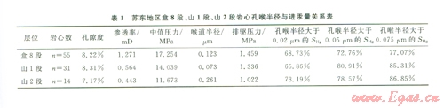 根據(jù)蘇東地區(qū)儲層物性,擁有70%以上可供油氣通過的喉道及其所控制的孔隙空間體積為基質(zhì)產(chǎn)氣提供條件,這時所對應的孔喉半徑值作為最小流動孔喉半徑[7]。根據(jù)蘇東地區(qū)氣藏樣品壓汞資料分析(1),可得出以下結論:盒8段、山1段最小流動孔喉半徑定為0.05µm,山2段最小流動孔喉半徑定為002 µm。