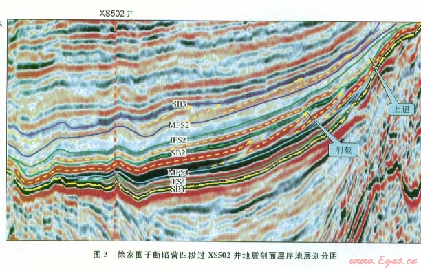 圖3 徐家圍子斷陷營四段過XS502井地震剖面層序地層劃分圖