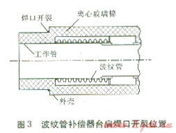 在暖管過程中,排潮管排出大量汽水混合物,管道沿線局部位置有熱水滲出地面。經過分析,選擇若干開挖點,開挖后進一步發(fā)現工作管與外護管問的絕熱層有大量進水,有4處外護管接口漏焊,有1處波紋管補償器外殼有砂眼漏汽,部分波紋管補償器外殼兩端變形嚴重、臺肩部位的焊口開裂(見圖3)。