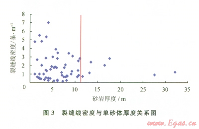低孔隙度、低滲透率滲砂巖儲層的厚度也是影響裂縫發(fā)育的重要因素。由于厚層砂巖的總體強度比薄層砂巖的總體強度大,抵抗外力破壞的能力強。如果其他條件一致的話,薄層比厚層有更高的裂縫密度,裂縫的線密度也比較大。從本區(qū)裂縫發(fā)育與砂巖厚度關系可以看出,單砂層厚度在