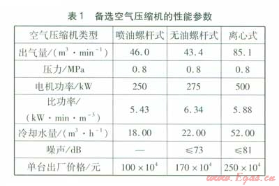 根據(jù)上述要求,可綜合選用噴油螺桿式空氣壓縮機(jī)、無(wú)油螺桿式空氣壓縮機(jī)、離心式空氣壓縮機(jī)。參考廠家的樣本資料,備選空氣壓縮機(jī)的性能參數(shù)見(jiàn)表l。