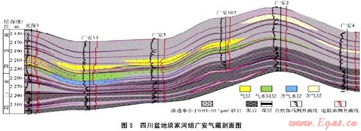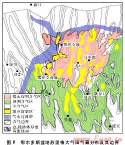 大范圍成藏組合是指“甜點(diǎn)”富集油氣,而成藏范圍很廣的一類成藏組合。這類組合主要形成于三明治式組合和倒灌式組合之中,以四川盆地川中地區(qū)須家河組和鄂爾多斯盆地中部奧陶系馬家溝組巖溶風(fēng)化殼代表??碧浇沂荆瑔我挥薪?jīng)濟(jì)性的油氣聚集范圍有限,但平面上由數(shù)十乃至上百個油氣藏散布于廣闊的區(qū)域內(nèi),油氣藏之間多被水區(qū)、致密區(qū)構(gòu)成的“天窗”阻隔,具有斑塊狀成藏特征。研究表明,導(dǎo)致成藏分布不連續(xù)的原因有二:①烴源灶分布不均勻、供烴總量不充分,近源儲集體優(yōu)先成藏;②儲集體的連續(xù)性較差,導(dǎo)致形成的油氣藏在很大的范圍內(nèi)呈星羅棋布式分布。如四川盆地須家河組氣藏(見圖8),由于須一、三、五段煤系源巖的連續(xù)性平面變化較大,一些區(qū)域煤系烴源巖明顯減薄甚至缺失,致使與之接觸的須二、四、六段儲集層中含氣飽和度與資源豐度平面上有明顯變化,煤系烴源巖減薄區(qū)(俗稱“天窗區(qū)”)成藏機(jī)率低,而優(yōu)質(zhì)烴源巖和有效儲集層疊置區(qū)是天然氣的主要富集區(qū),形成的氣藏儲量豐度與含氣飽和度相對較高。