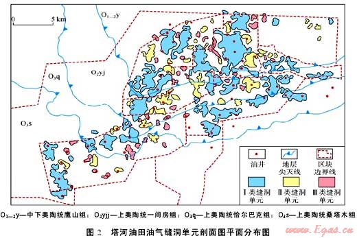大型化成藏包含兩方面含義:①成藏要素的大型化發(fā)育與平面上的規(guī)模變化。從成藏要素看,烴源灶、儲集體以及生儲蓋組合的分布面積至少在數(shù)千甚至上萬平方千米以上,如鄂爾多斯盆地上古生界石炭系煤系烴源巖與二疊系碎屑巖儲集層,分布面積都超過20×104km2。從成藏要素的規(guī)模變化看,烴源灶、儲集體的平面分布存在強(qiáng)烈的非均勻性,致使形成的地層和巖性圈閉在橫向上具有多變性,呈集群式分布。如塔里木盆地輪南—塔河奧陶系碳酸鹽巖縫洞型大油氣田,可以劃分出數(shù)百個縫洞單元,每個縫洞單元都是一個相對獨(dú)立的油氣聚集單元,形成的油氣藏呈集群式分布(見圖2)。②成藏分布樣式上表現(xiàn)為薄餅式或集群式成藏,這是中低豐度油氣藏群區(qū)別于常規(guī)高豐度油氣藏(田)和非常規(guī)連續(xù)型油氣聚集最典型的特征。