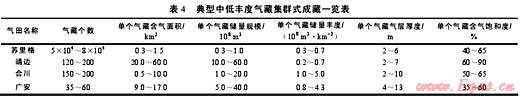 集群式成藏是指油氣在一系列呈集群式發(fā)育的地層、巖性圈閉中聚集而形成的一類成藏現(xiàn)象。這是由于在克拉通盆地平緩臺地區(qū)的碳酸鹽巖層系、陸內(nèi)坳陷海陸過渡相與陸相層系以及前陸盆地緩翼廣大斜坡區(qū)的陸相沉積層系中,因建設(shè)性成巖和后生成巖改造作用,或由于原始沉積物源區(qū)巖性多變、水動力能量多變等,導(dǎo)致儲集層非均質(zhì)性強(qiáng),形成眾多呈獨(dú)立或半獨(dú)立狀分布的聚集體,就像玻璃板中眾多大小不一的氣泡,單體規(guī)模不大,但儲集體眾多則形成了規(guī)模巨大的集合體(見表4)。當(dāng)油氣充注后,不僅形成的油氣藏群規(guī)模很大,而且這些規(guī)模巨大的油氣藏群對封蓋條件的要求也不高,只要有遮擋條件(多數(shù)小于幾個兆帕)就可規(guī)模成藏,其中豐度較高的油氣藏(俗稱“甜點(diǎn)”)是油氣勘探的重點(diǎn)。如鄂爾多斯盆地蘇里格氣田盒8段心灘砂體,由于巖性、物性橫向變化劇烈,致使大氣田由成千上萬個單體規(guī)模較小的氣藏群構(gòu)成,常規(guī)小型巖性氣藏之間連續(xù)或不連續(xù)分布著含氣飽和度較低的致密氣層、干層或水層(蘇里格西區(qū)低部位),總體表現(xiàn)為非常規(guī)氣與常規(guī)氣的混合共生。根據(jù)對蘇里格氣田的解剖,氣田的含氣面積接近3.3×104km2,依據(jù)砂體形態(tài)可以確定的氣藏數(shù)量約5×104~8×104個,單個氣藏氣柱高度2~6m、儲量規(guī)模一般在3000×104~10000×104m3,整個氣田的平均儲量豐度約0.7×108m3/km2。致密砂巖普遍含氣,含氣飽和度不高但連續(xù)分布。