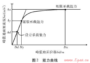 能力——需求譜分析方法的理論基礎(chǔ)為目前在抗震設(shè)計(jì)中廣泛采用的靜力彈塑性分析方法,即Push-over分析方法。建構(gòu)筑物在地震中的反應(yīng)由能力曲線代表,該曲線反映了結(jié)構(gòu)受到地震橫向載荷與頂點(diǎn)位移關(guān)系曲線(能力譜)。再將地震波到達(dá)建構(gòu)筑物場(chǎng)地的反應(yīng)譜轉(zhuǎn)化為需求譜,兩曲線的交點(diǎn)即性能點(diǎn),作為建筑物在地震作用下的峰值位移或加速度。