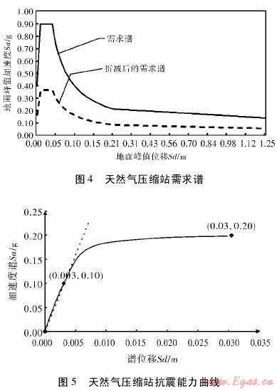 為了進(jìn)一步得到該站抗震能力曲線。以圖2所示能力曲線為基本形狀,并依據(jù)HAZUS-MH對(duì)相關(guān)能力曲線參數(shù)進(jìn)行設(shè)置。本例中屈服承載能力與極限承載能力兩個(gè)控制點(diǎn)相關(guān)參數(shù)設(shè)置如下:Cs0.05,Te0.35,α為0.75,γ為1.5,λ為2,μ為5。將以上參數(shù)代入能力譜控制點(diǎn)公式,得到該天然氣壓縮站抗震能力曲線如圖5所示。