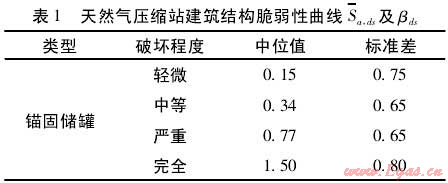 由于我國(guó)缺少燃?xì)鈮嚎s站脆弱性曲線相關(guān)數(shù)據(jù),這里依據(jù)HAZUS中建議采用相關(guān)參數(shù),如表1所示,擬合出的天然氣壓縮站的脆弱性曲線,如圖7所示。