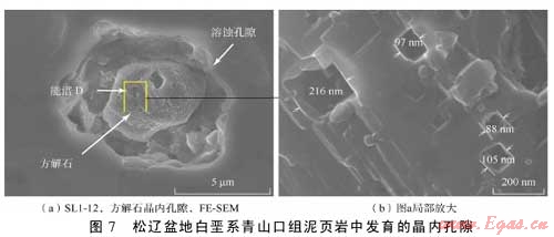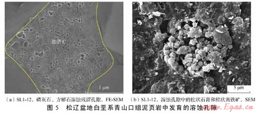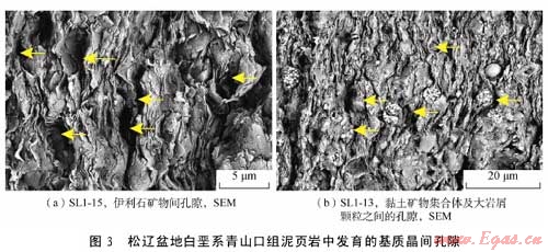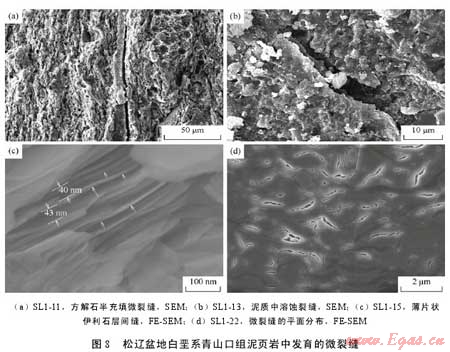 摘 要:為了查明泥頁巖系統(tǒng)微觀孔隙發(fā)育特征及其油氣地質(zhì)意義,利用掃描電鏡及場發(fā)射掃描電鏡二次電子成像技術對松遼盆地白堊系青山口組一段泥頁巖中的微觀孔隙進行了系統(tǒng)觀察。該套泥頁巖中主要發(fā)育了5種類型孔隙,即基質(zhì)晶間孔、有機質(zhì)孔、溶蝕孔、粒間孔、晶內(nèi)孔;此外,還發(fā)育大量微米—亞微米級(納米級)微裂縫,包括溶蝕縫、充填縫及層間縫3類。微孔隙和微裂縫構(gòu)成復雜微裂縫網(wǎng)絡-孔隙系統(tǒng),為烴源巖生成的油氣向外排驅(qū)提供了有效通道,同時也為殘留在頁巖中的油氣提供了充分的儲集空間,對于油氣的初次運移以及頁巖油氣等非常規(guī)資源的儲集具有重要意義。