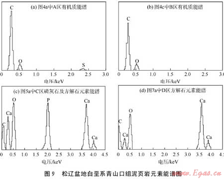 有機質(zhì)孔隙主要指有機質(zhì)團塊內(nèi)部或有機質(zhì)生烴后內(nèi)部殘留的孔隙。圖4為場發(fā)射掃描電鏡二次電子成像后觀察到的泥頁巖樣品中的有機質(zhì)孔隙,圖4a為有機質(zhì)團塊中的孔隙(圖4a中黃線標出的黑灰色區(qū)域A區(qū)對應的元素能譜見圖9a),孔徑為10~1500nmz已經(jīng)向烴類轉(zhuǎn)化,伴隨這一地質(zhì)過程,泥頁巖中產(chǎn)生大量有機質(zhì)生烴后的殘留孔隙,若泥頁巖處于高—過成熟階段,有機質(zhì)生烴后的殘留孔隙數(shù)量會大幅增加,其孔徑也會變大。