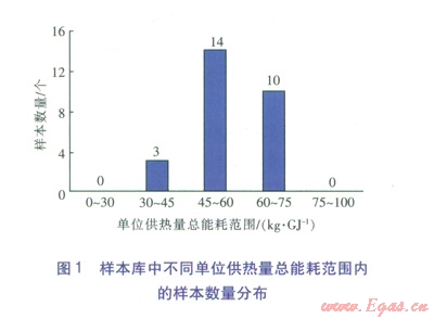 樣本庫中不同單位供熱量總能耗范圍內(nèi)的樣本數(shù)量分布見圖l。