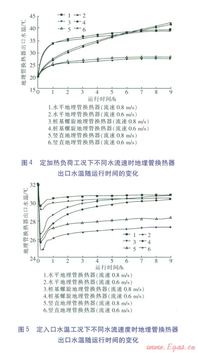 樁基螺旋地埋管換熱器的出口水溫隨時間升高得較快,主要原因為:樁基螺旋地埋管換熱器的螺距較小,相鄰地埋管相互影響,地埋管內(nèi)傳熱介質(zhì)的熱量只能向樁基外的土壤和樁基內(nèi)的混凝土兩個方向傳遞,導(dǎo)致地埋管換熱器有效換熱面積減小,換熱性能下降。由圖4可知,在定加熱負荷工況下,流速對地埋管換熱器出口水溫影響較小。