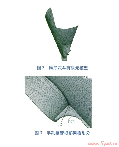 錐形灰斗有限元模型見圖2。將幾何模型共劃分成68 545個(gè)單元,l37 373個(gè)節(jié)點(diǎn)。手孔接管根部網(wǎng)格劃分見圖3,圖中數(shù)值單位為mm