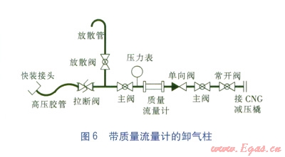 對(duì)于在卸氣柱上增加質(zhì)量流量計(jì)的工藝。是從CNG加氣機(jī)的工藝流程借鑒過來的,還應(yīng)該在流量計(jì)之前增加壓力表,為卸氣柱增加一個(gè)箱體,另外,拉斷閥、單向閥(此處的單向閥還有防止管道氣逆流時(shí),保護(hù)質(zhì)量流量計(jì)的作用)必須加裝。帶質(zhì)量流量計(jì)的卸氣柱見圖6。