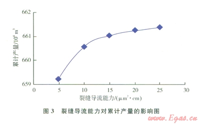 圖3是累計(jì)產(chǎn)量與裂縫導(dǎo)流能力的關(guān)系曲線??梢钥闯?,存在累計(jì)產(chǎn)量與裂縫長度相似的變化規(guī)律。隨著導(dǎo)流能力增加,累計(jì)產(chǎn)量先逐漸增大后趨于平穩(wěn)。要充分發(fā)揮致密氣藏壓裂水平井的潛能,就要使裂縫導(dǎo)流能力與地層滲透率相匹配。本算例中,推薦最佳裂縫導(dǎo)流能力為10~15μm2·cm。