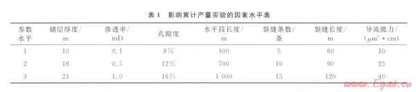 將儲層厚度、滲透率、孔隙度、水平段長度、裂縫條數(shù)、裂縫長度、裂縫導(dǎo)流能力作為影響累計(jì)產(chǎn)量的7個因素,再根據(jù)各因素選取了3個水平(表1)。