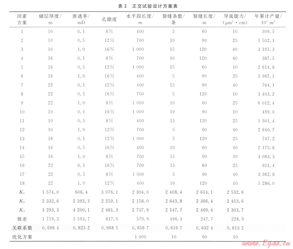 2)采用正交試驗(yàn)分析理論對氣藏壓裂水平井產(chǎn)能參數(shù)的影響程度進(jìn)行了分析,并運(yùn)用灰色關(guān)聯(lián)分析方法進(jìn)行了檢驗(yàn),找出了影響研究區(qū)塊壓裂水平井產(chǎn)能的主要參數(shù)排序依次為:地層滲透率、儲層厚度、孔隙度、水平段長度、裂縫條數(shù)、裂縫長度、導(dǎo)流能力。