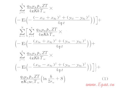 將裂縫單翼均等分成竹份,每等份可以看成是一個點(diǎn)匯。利用無限大均勻地層點(diǎn)匯定流量的壓降公式,可以求出該點(diǎn)匯對地層中任意一點(diǎn)產(chǎn)生的壓降[8-10];將地層任意一點(diǎn)替換為裂縫尖端,就可以得到所有點(diǎn)匯同時生產(chǎn)時對裂縫尖端產(chǎn)生的壓降;考慮到裂縫半長遠(yuǎn)大于水平井筒半徑,裂縫內(nèi)流體從裂縫邊緣向井筒周圍聚集,第i條裂縫可以看成是流動直徑為裂縫長度、地層厚度為裂縫寬度、邊界壓力為裂縫尖端壓力、井底流壓為水平井井筒內(nèi)壓力的微型平面徑向流油藏;根據(jù)壓力連續(xù)和流量守恒方程,就能得到考慮裂縫干擾的壓裂水平井油井產(chǎn)量預(yù)測模型[2,5];進(jìn)一步根據(jù)壓力函數(shù)的定義和真實(shí)氣體狀態(tài)方程,并將地層條件下的產(chǎn)量換算為地面標(biāo)準(zhǔn)情況下氣體產(chǎn)量,就可以得到氣藏壓裂水平井產(chǎn)量預(yù)測模型: