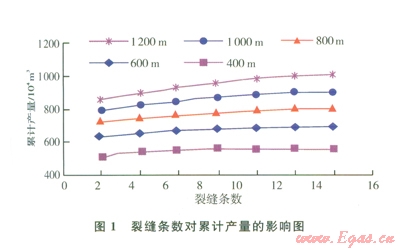 圖1是不同水平段長度、不同裂縫條數(shù)下生產(chǎn)l年的累計(jì)產(chǎn)量??梢钥闯?,隨著裂縫條數(shù)增加,累計(jì)產(chǎn)量先增加最后趨于平穩(wěn)。因?yàn)殡S著裂縫條數(shù)增加,裂縫間距變小,相互間干擾加重,導(dǎo)致每條裂縫產(chǎn)量減小造成的??紤]到裂縫條數(shù)增加,作業(yè)成本增大,因此存在一個最佳裂縫條數(shù)。當(dāng)水平段長度為