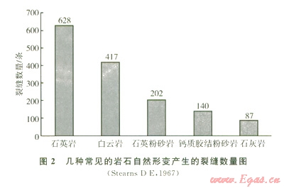 巖石在構造應力作用下會發(fā)生變形,當變形超過破裂強度時巖石將發(fā)生破碎,產(chǎn)生裂縫。不同的巖石在相同的應力作用下形變不同,產(chǎn)生的裂縫數(shù)也不相同,即強度決定巖石裂縫的多少(2)