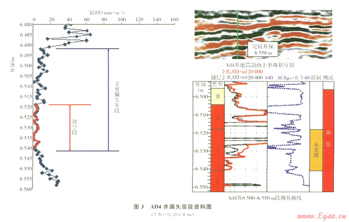 鉆井完井過程中,在奧陶系一間房組6 486.02 m發(fā)生井漏,在鉆進過程中發(fā)生間斷性漏失。其中6 491.866 541.0 m段為主要井漏段,其中6 518.006 541.00 m段強行鉆進過程中,鉆壓060 kN,鉆進液漏失速率4460 m3h,鉆時一般維持在25minm,部分井段鉆時1 minm,故認為此段為放空段,漏失段長23 m。隨后發(fā)生多次溢流,經(jīng)多次壓井才順利完鉆,共漏失鉆井液7 042 m3。最大漏速70 m3h,平均漏速40.9 m3h。地震、測井資料均顯示此段漏失嚴重(3)