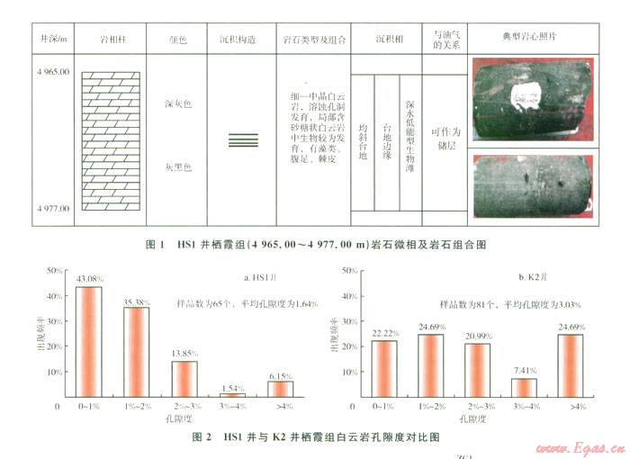 測井電性特征是巖石本身以及巖石內(nèi)部流體等綜合反映的結(jié)果,這也是進(jìn)行測井解釋儲層及其含流體情況的基礎(chǔ)。儲層的儲集性能主要受沉積環(huán)境、成巖作用的影響。依據(jù)前人的研究成果,結(jié)合野外地質(zhì)觀察發(fā)現(xiàn),川西地區(qū)棲霞組儲層主要為生物灘,古生物化石從破碎到完整均有,不具抗浪格架,平面上由于位置不同,沉積環(huán)境的不同,其結(jié)構(gòu)組分和后期成巖作用也有著明顯的差異。根據(jù)川西地區(qū)棲霞組巖心觀察和野外露頭結(jié)果認(rèn)為,川西南部地區(qū)棲霞組巖性主要為水體能量較低的泥品灰?guī)r夾細(xì)-中晶白云巖化灰?guī)r。從巖心觀察看,HS1井棲霞組取心段巖性主要為深灰-灰黑色白云巖,局部發(fā)育中晶白云巖(圖1)。根據(jù)65個柄霞組巖心樣品物性分析表明,HS1井孔隙度分布范圍較大,介于0.1 6%~l0.39%,主要孔隙度集中在0~2%之間,平均孔隙度僅為l.64%,明顯低于川西北部地區(qū)K2井棲霞組巖心的平均孔隙度(3.03%),滲透率極低,一般均小于0.008 mD(圖2)。儲層物性特征表明,川西南部地區(qū)棲霞組儲層具有低孔隙度、低滲透率致密碳酸鹽巖儲層的特征,雖然儲層中局部存在高孔隙度、高滲透率段,但總體看來儲層儲集性能差,根據(jù)四川盆地碳酸鹽巖儲層劃分標(biāo)準(zhǔn)來看應(yīng)屬于差儲層-非儲層。
