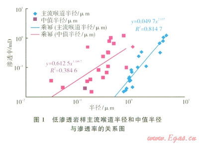 喉道大小及分布是控制儲層滲流能力的關鍵。定義對滲透率累積貢獻達95%以前喉道半徑的加權平均值為主流喉道半徑。須家河組不同儲層巖樣主流喉道半徑和中值半徑與滲透率關系表明(圖1),主流喉道半徑隨滲透率的增加而增加,二者之間存在非常好的正相關關系;但是中值半徑與滲透率之間的相關性較差。這說明主流喉道半徑不僅能表征儲層基質(zhì)的滲透能力,而且能夠反映儲層微觀孔隙結構特征。