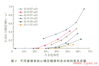 低滲透砂巖含水氣藏巖樣滲流實驗表明,當含水飽和度較高時,氣體滲流出現(xiàn)非達西流現(xiàn)象,存在閾壓梯度[8]。閾壓梯度與巖心滲透率及含水飽和度相關(圖2),巖心滲透率越低,含水飽和度越高,閾壓梯度越大。閾壓梯度可作為衡量儲層流動性強弱的指標,也是影響儲量動用程度的重要參數(shù),因此,將閾壓梯度作為低滲含水儲層評價參數(shù)是必要的。