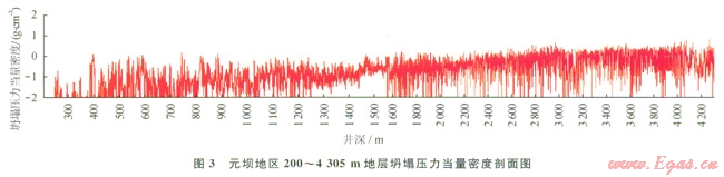根據(jù)井壁穩(wěn)定性分析結(jié)果,深度小于2800m的地層當量應(yīng)力低于地層巖石的綜合強度,氣體鉆井井壁穩(wěn)定性較好如圖2,而深度超過2800m的地層坍塌密度高于空氣鉆井臨界坍塌壓力當量密度值(圖3),這些層段‘營氣鉆井過程中存在垮塌掉塊,可通過優(yōu)化鉆井參數(shù)來克服,并做好氣液轉(zhuǎn)換準備;千佛崖組—須家河組地層氣體鉆井穩(wěn)定性較差,YB3井在自流井組3727.8~3791.5m應(yīng)用氮氣鉆井,僅進尺63.7m,不但后期通井循環(huán)時間較長,鉆井費用也有所增加,在目前技術(shù)條件下該井段采用氣體鉆井還存在一定難度。
