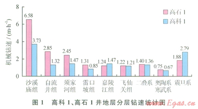 海相地層占全井進尺的57%(約3000m),巖石強度高,硅質(zhì)含量重,部分層段含燧石結(jié)核和角礫云巖,機械鉆速極低,高科1井、高石l井各地層平均機械鉆速統(tǒng)計如圖1所示,不能采用氣體鉆提速的陸相碎屑巖地層的平均機械鉆速小于2.50m/h,嚴(yán)重影響了全井鉆井速度。