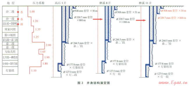 第二輪井的井身結(jié)構(gòu)設(shè)計以地層3個壓力剖面為依據(jù),在充分分析地質(zhì)條件后,對Æ339.7mm表層套管下深進行了合理調(diào)整至500~600m(圖2中的磨溪11井),縮短了Æ444.5mm井眼段進尺300~500m,確保Æ311.2mm井眼在鉆遇氣層后具備一定的井控能力,實施后的施工周期同比節(jié)約了6~7d。