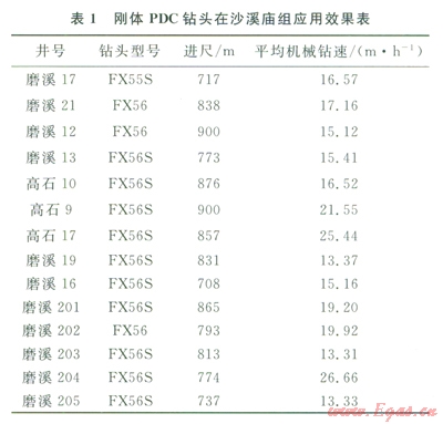 通過試驗與優(yōu)化改進PDC鉆頭,逐步優(yōu)選出適應(yīng)各層位的PDC鉆頭型號(圖6),機械鉆速和單只鉆頭進尺大幅度提高,第二批正鉆井在沙溪廟地層試驗剛體PDC鉆頭取得新進展,平均機械鉆速由傳統(tǒng)胎體PDC鉆頭7.24m/h提高到16.27m/h(表1),已接近空氣鉆進效果。